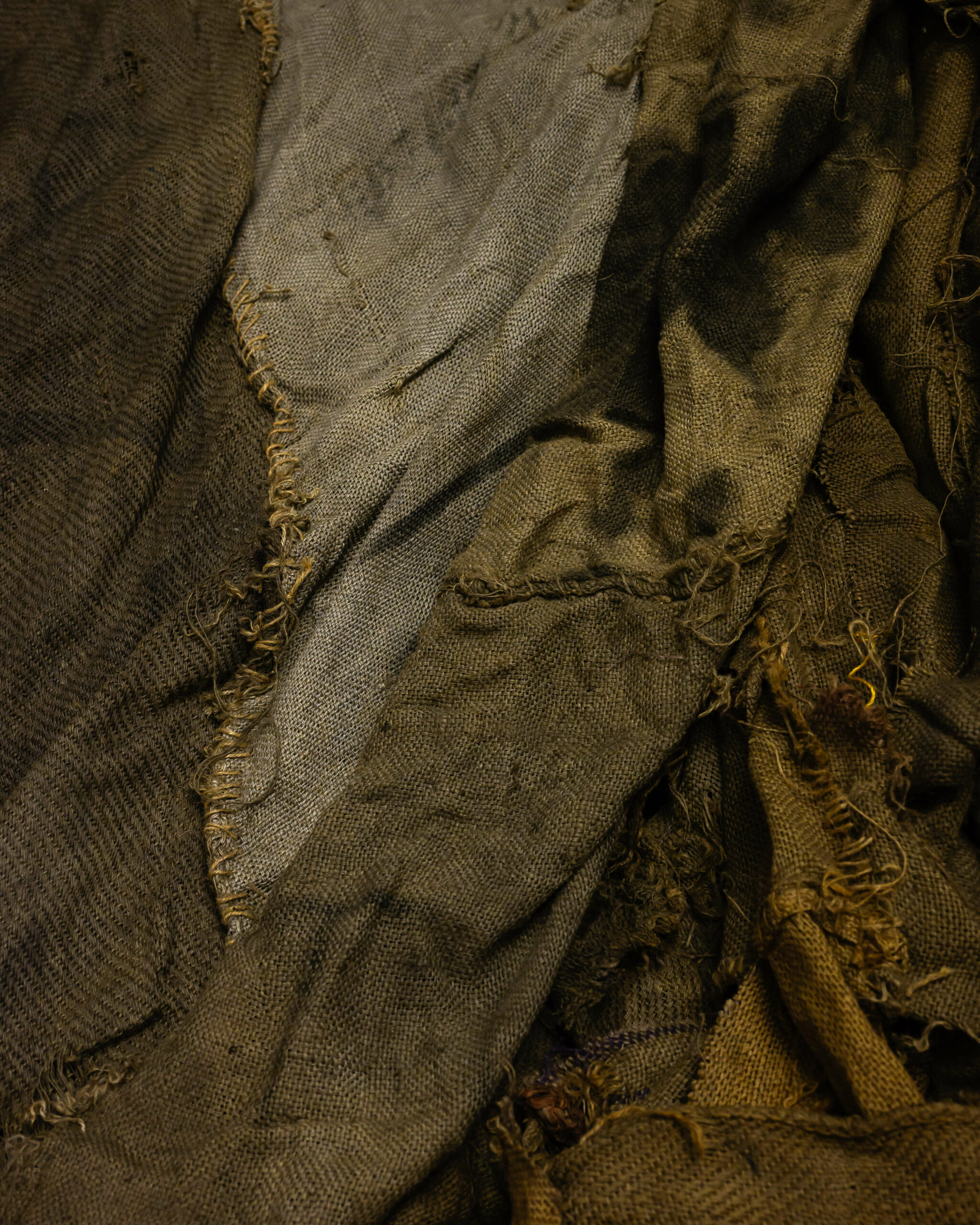 Sika Asem was created using the artist’s signature medium: jute sacks. These sacks, once used to transport cocoa, rice, and charcoal, are documents bearing traces of human labor, transnational trade, and environmental degradation. Imported from Ghana and reused through successive cycles of industrial use, they become tangible evidence of global capitalism, colonial legacy, and ecological crisis. For Mahama, they are not neutral objects, but carriers of memory, marked by human sweat and signs of wear, in which erased histories are simultaneously embodied.