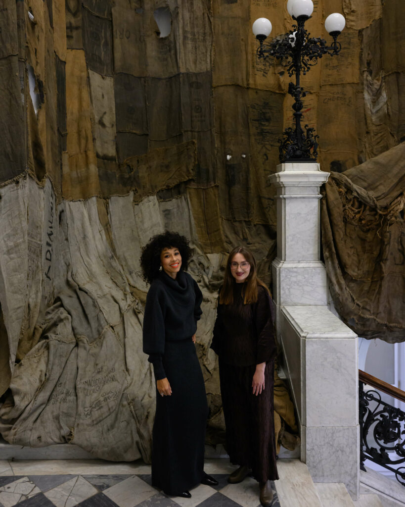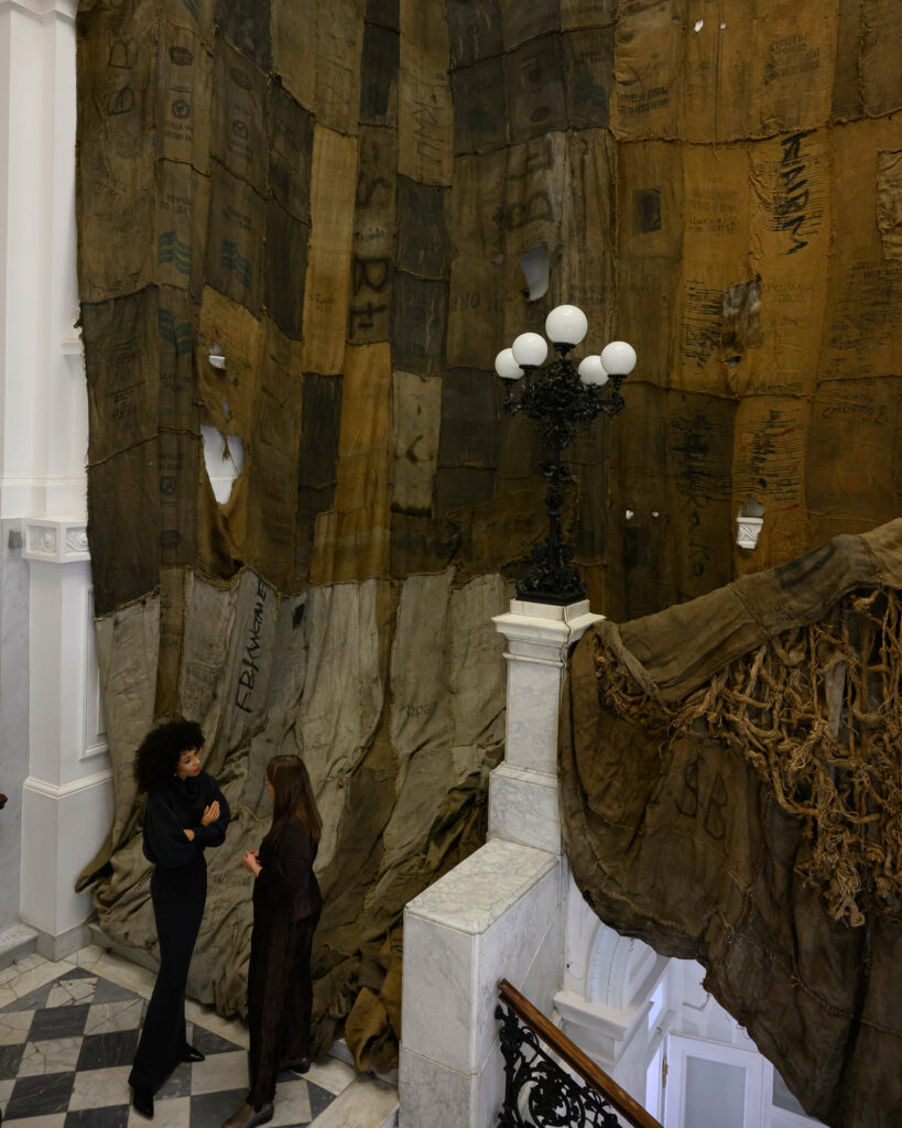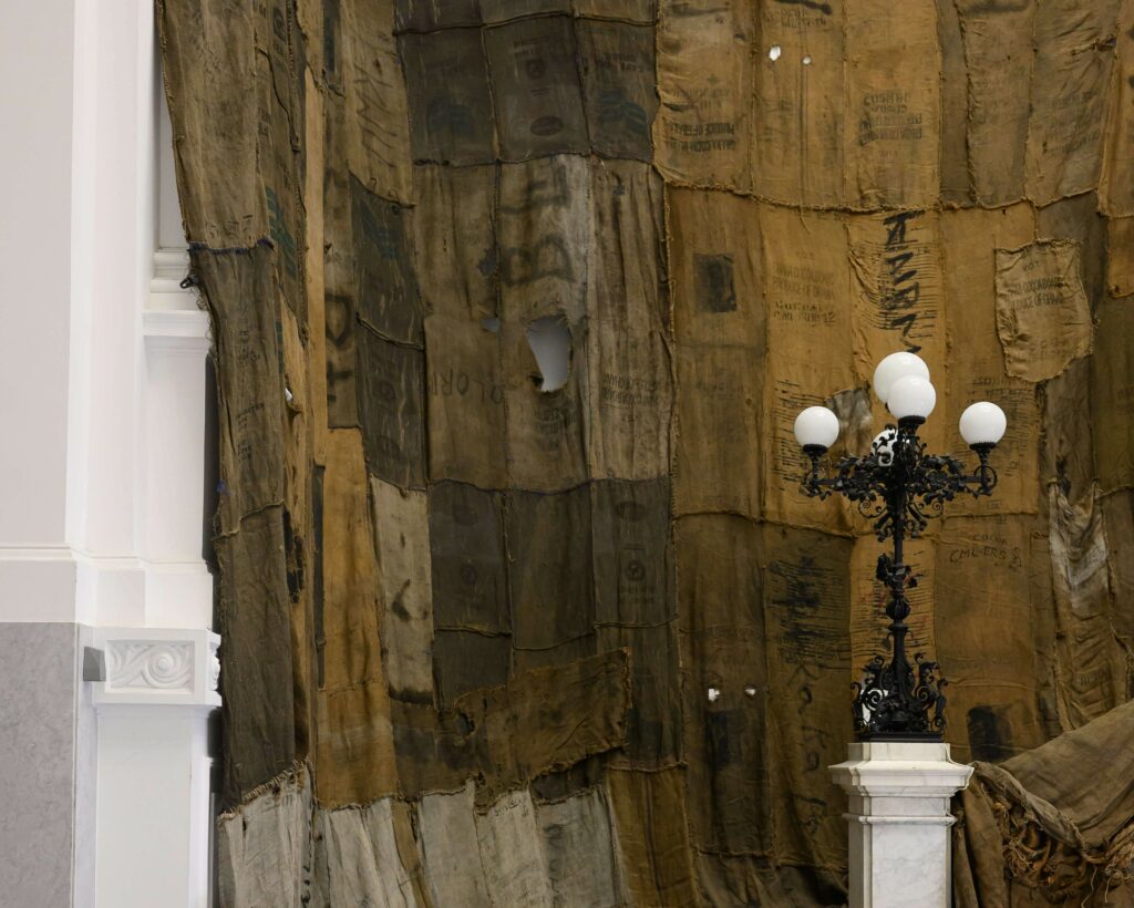 As part of the ongoing cooperation between OmenaArt Foundation and Zachęta – National Gallery of Art, the monumental work by Ibrahim Mahama was created, one of the most outstanding contemporary artists from Ghana. For the first time in Poland, the artist realised a large-scale site-specific work in the historic building of Zachęta. The installation is part of the exhibition What Are Our Collective Dreams? Global Connections — Abandoned Friendships.